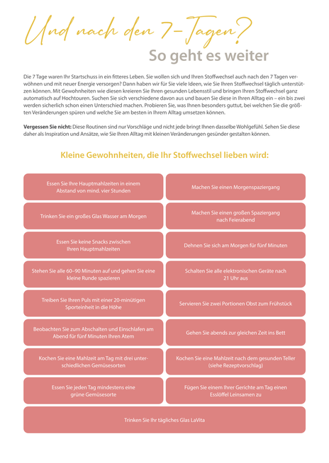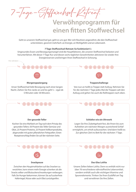 Schon kleine Veränderungen können Großes bewirken: Mit unserem 7-Tage-Stoffwechsel-Retreat bringen Sie Ihren Stoffwechsel sanft in Schwung – einfach im Alltag umsetzbar. Es erwarten Sie leckere, einfache Rezepte, entspannende Impulse und Tipps für neue Energie. Das perfekte Mini-Retreat für zu Hause.
