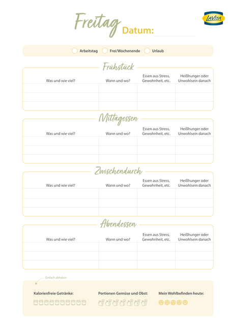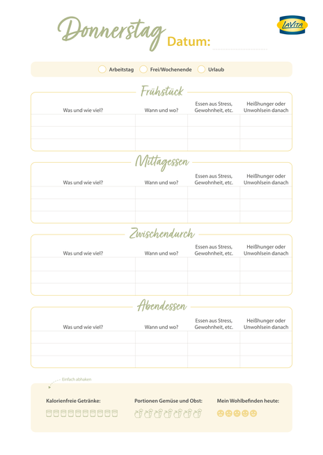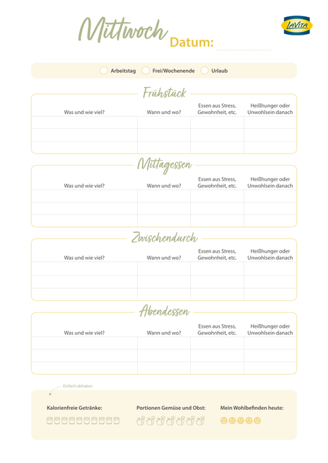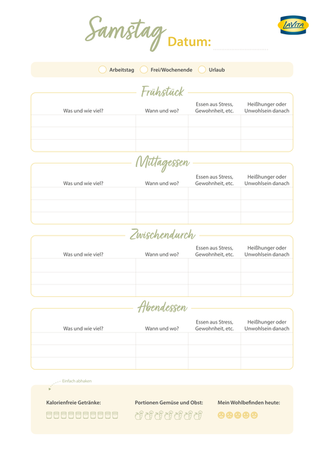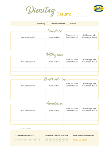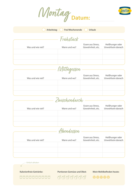 Mit unserem Ernährungstagebuch können Sie ganz einfach Ihre Ernährung analysieren und Schwachstellen aufdecken. Es hilft Ihnen, Unverträglichkeiten zu identifizieren und zeigt, wo Sie Anpassungen vornehmen können, um sich gesünder zu ernähren. Nutzen Sie unser Tagebuch als Werkzeug, um langfristig gesunde Gewohnheiten zu entwickeln.
