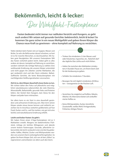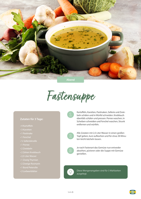 Fasten muss nicht schwer oder langwierig sein. Mit unserem 3-Tage-Wohlfühl-Fastenplaner können Sie Ihrem Körper eine Auszeit gönnen – perfekt für ein Wochenende und auch mit der Arbeit vereinbar. Gesunde, nährstoffreiche Mahlzeiten unterstützen Sie dabei.