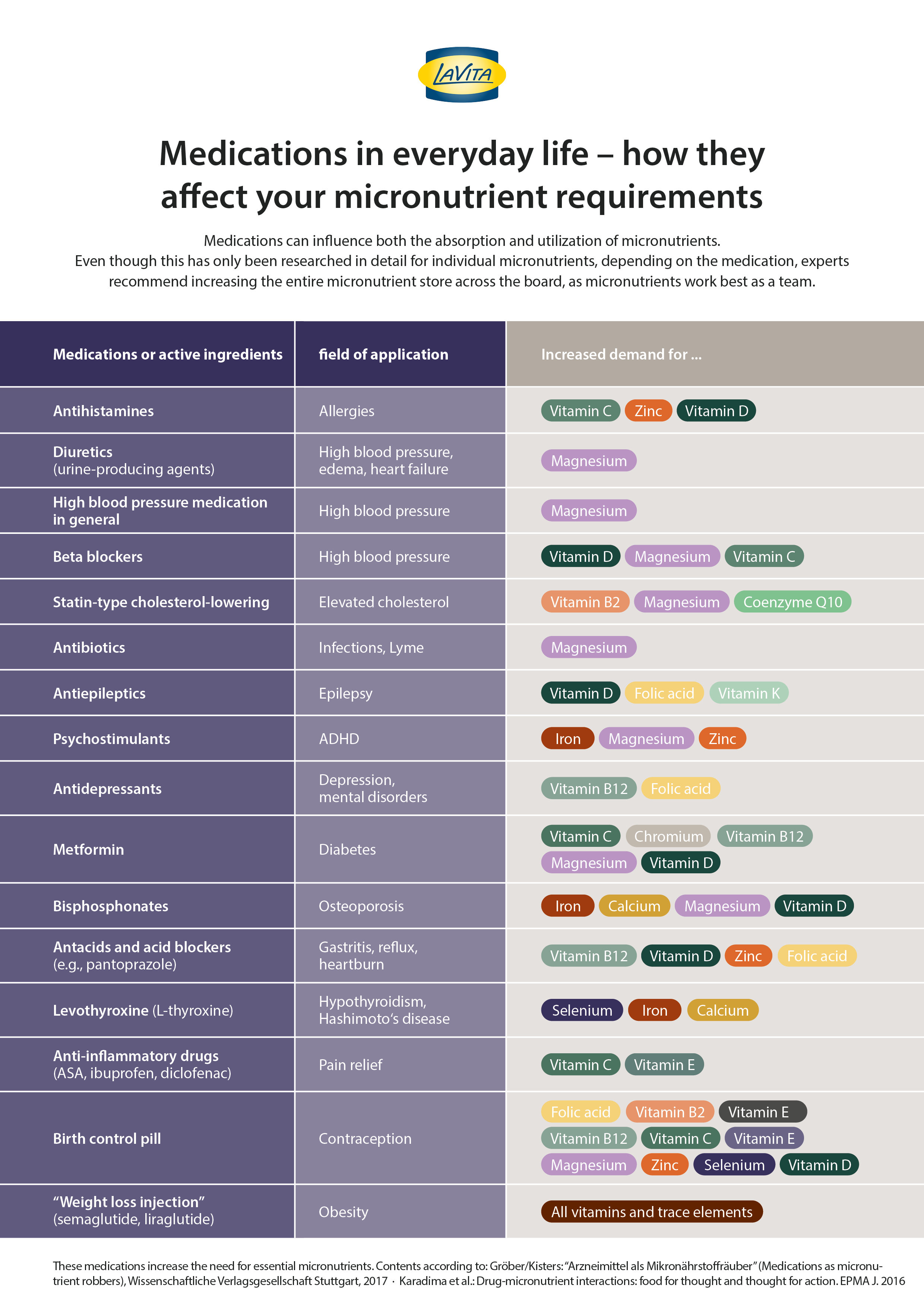 You may be wondering if your medication also belongs to those that cause an increased need for nutrients? Unfortunately, there are hardly any medications that reduce symptoms without affecting other metabolic processes. In addition, not only older people often take several medications at the same time, further diversely affecting the body. Therefore, it is important to take care of your micronutrient balance early on to prevent deficiencies. Many are surprised that even common medications such as the pill, over-the-counter acid blockers, or regular painkillers can have a significant impact. In the following PDF we provide for you an overview of the most commonly used medications that affect our micronutrient balance - the list could be continued indefinitely.